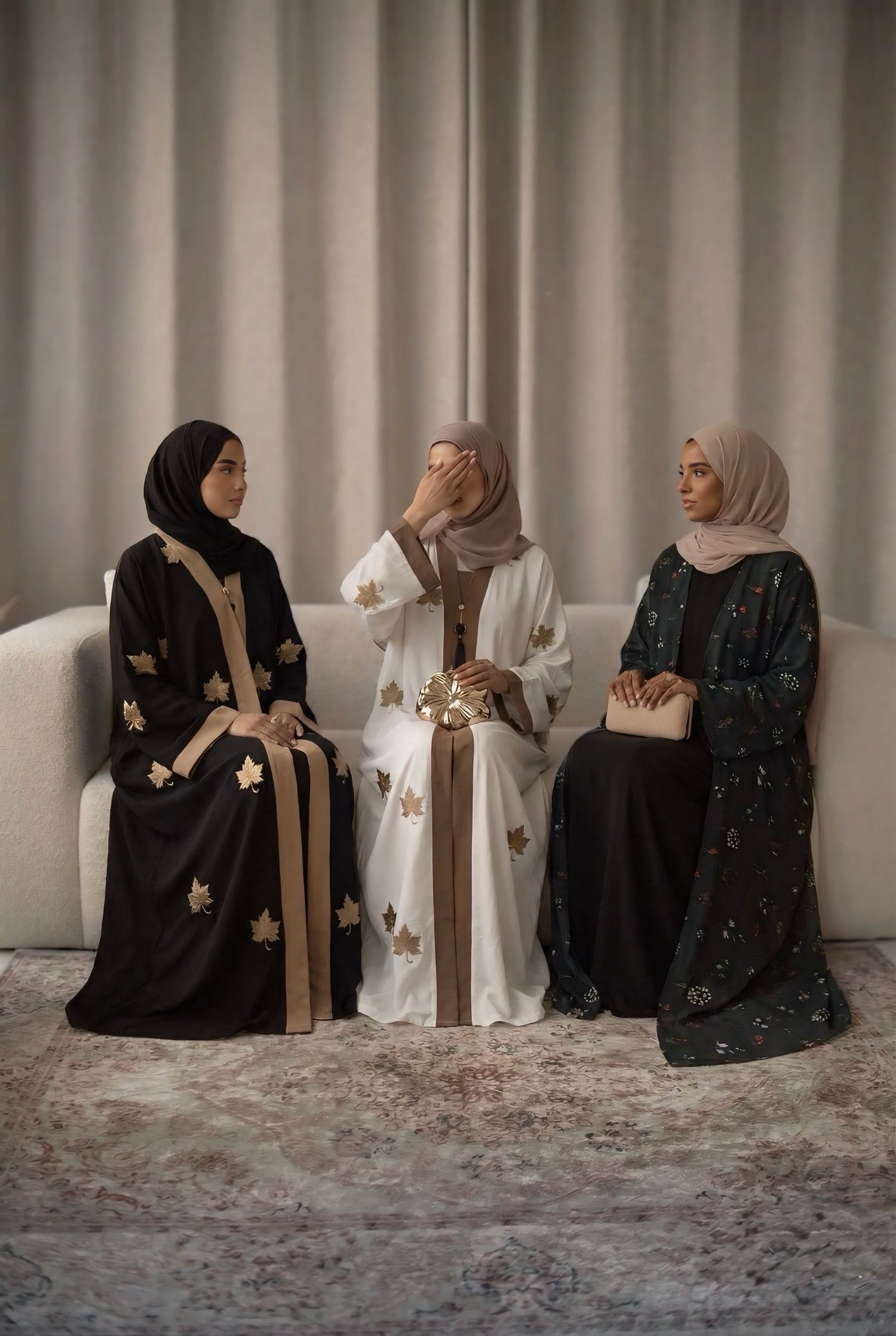 🤍 White Maple Leaf Embroidered Abaya | Elegant Modest Wear | Free UK Shipping